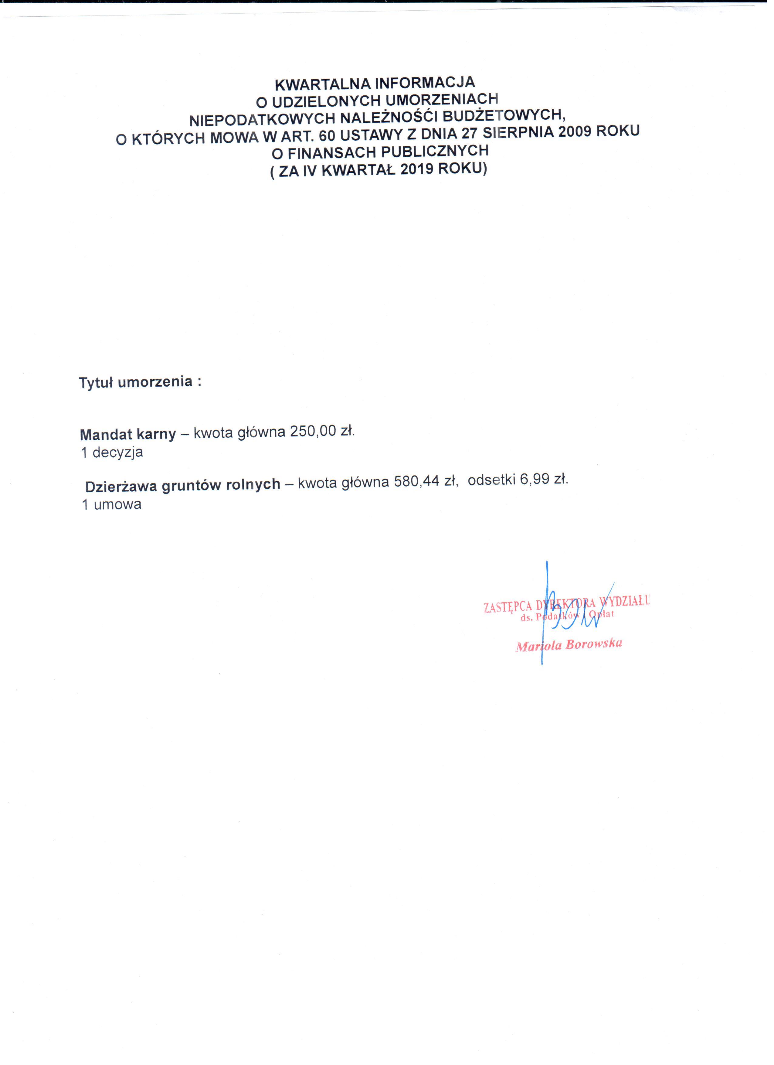 - KWARTALNA INFORMACJA O UDZIELONYCH UMORZENIACH NIEPODATKOWYCH NALEŻNOŚCI BUDŻETOWYCH za IV kwartał 2019 roku