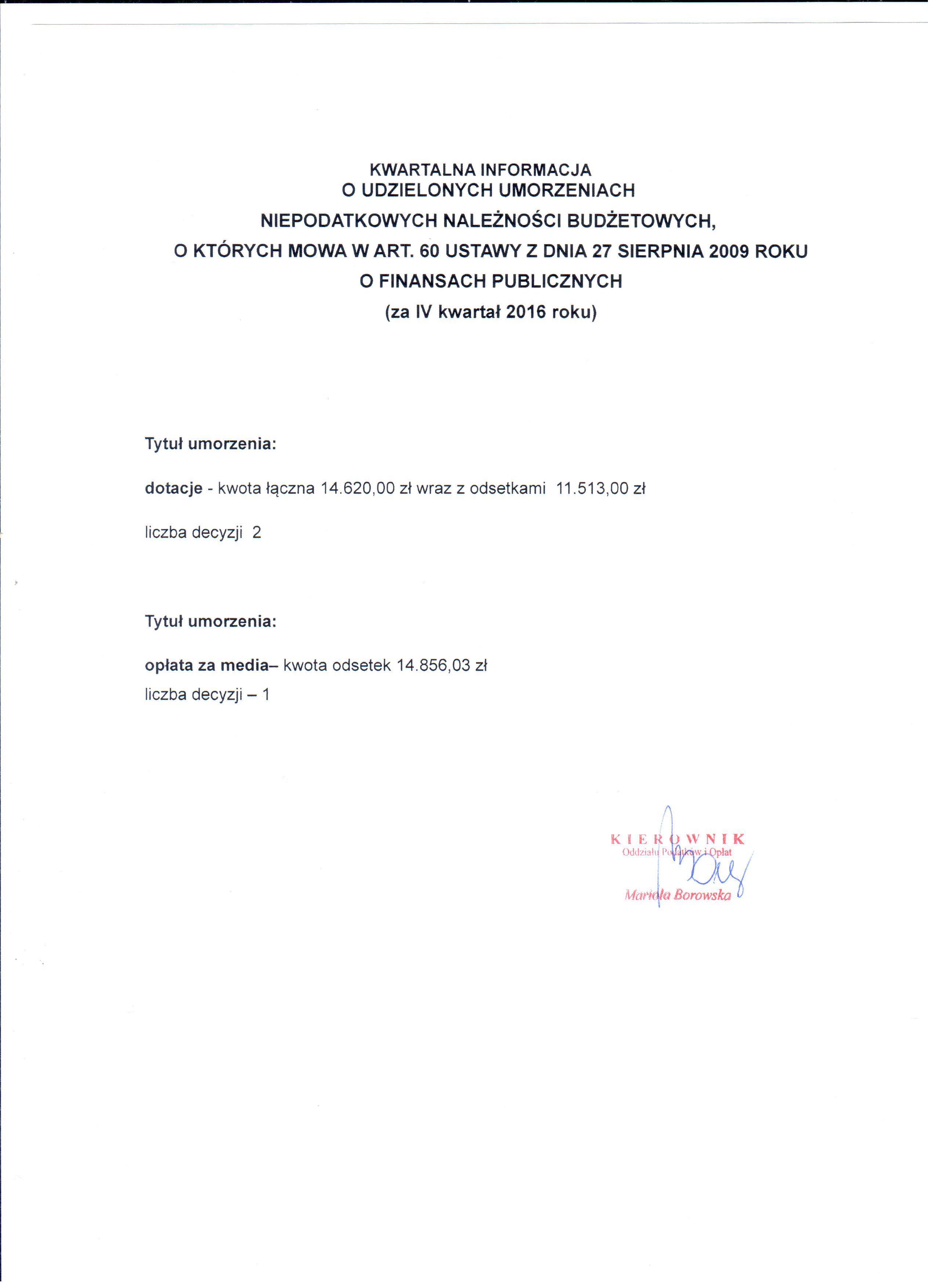 - KWARTALNA INFORMACJA O UDZIELONYCH UMORZENIACH NIEPODATKOWYCH NALEŻNOŚCI BUDŻETOWYCH za IV kwartał 2016 roku