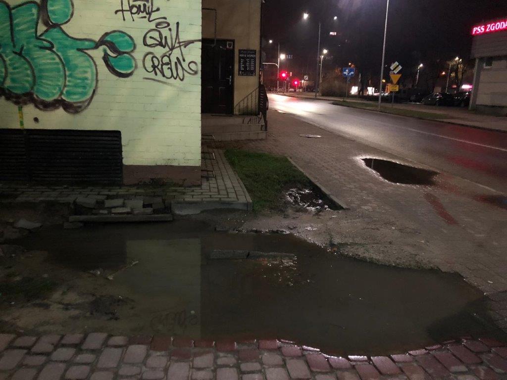 zbiera się rozlewisko wody, ponadto doszło w tym miejscu do uszkodzenia kostki